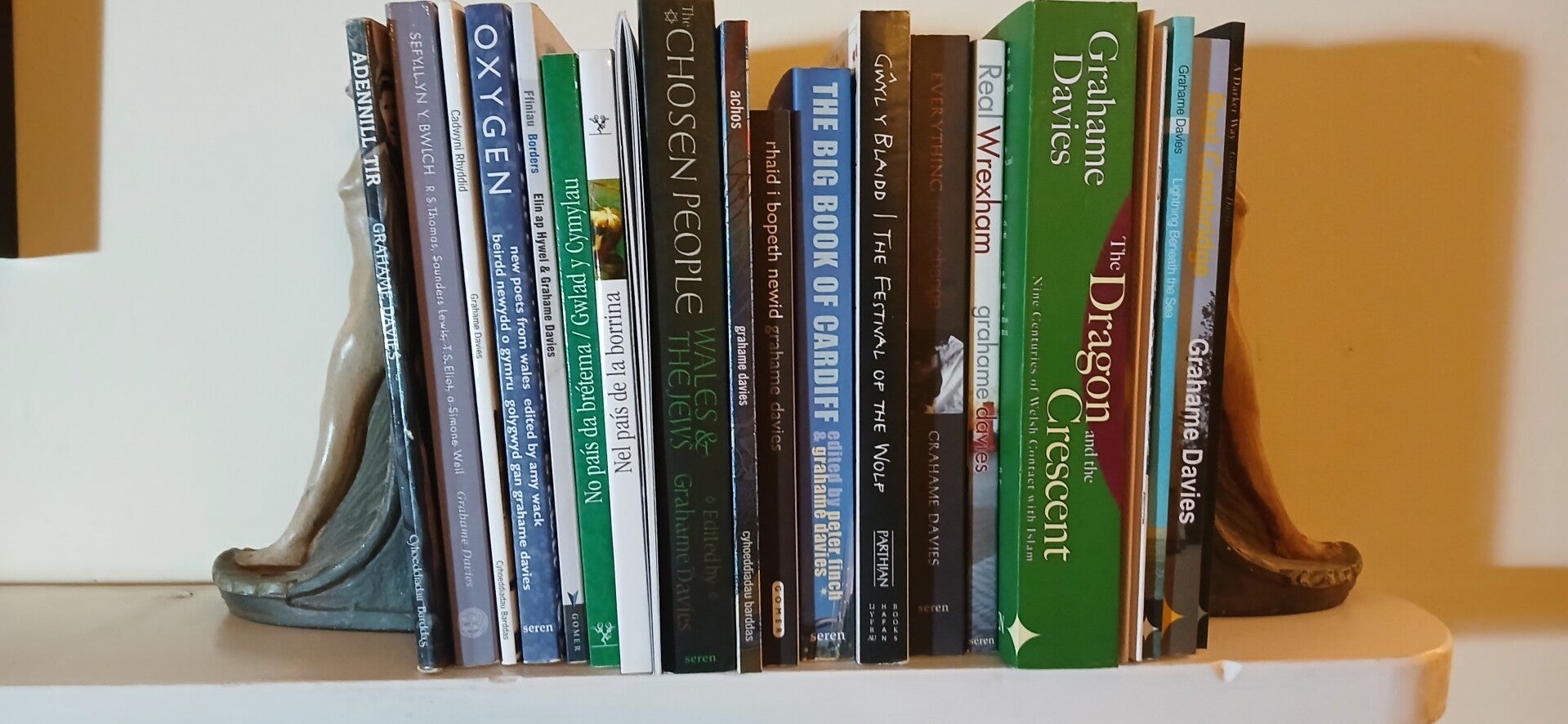 Award-winning poetry in Welsh and English, social and religious studies on Judaism and Islam, an award-nominated novel, and two volumes of psychogeography, plus several themed anthologies.